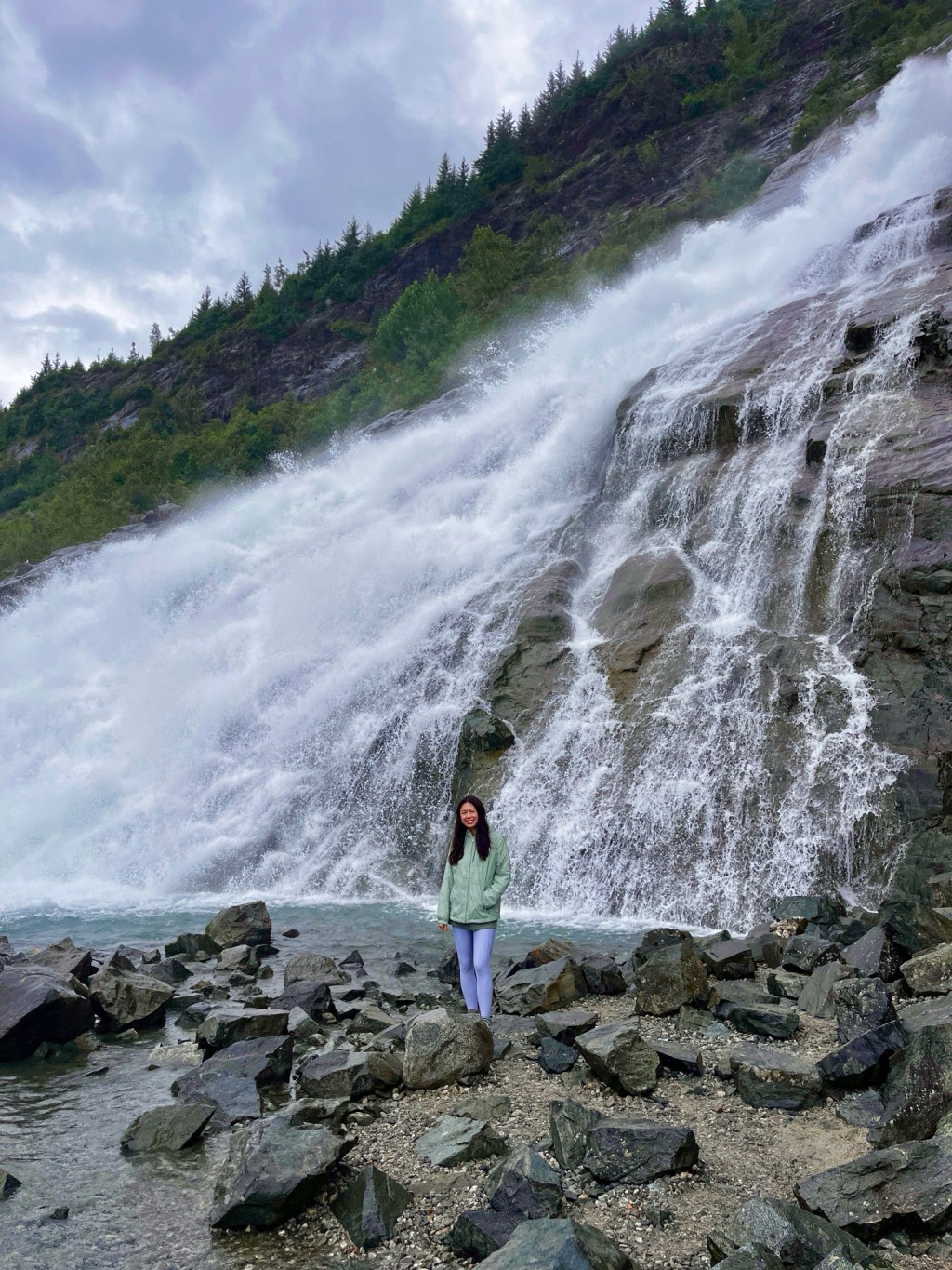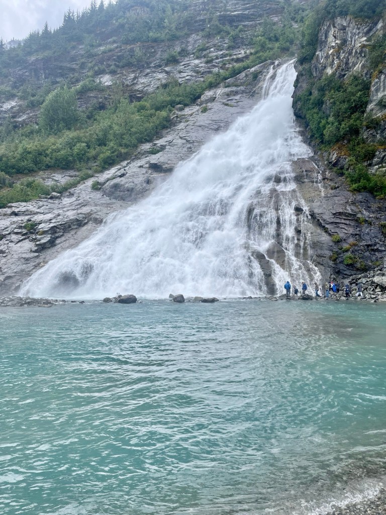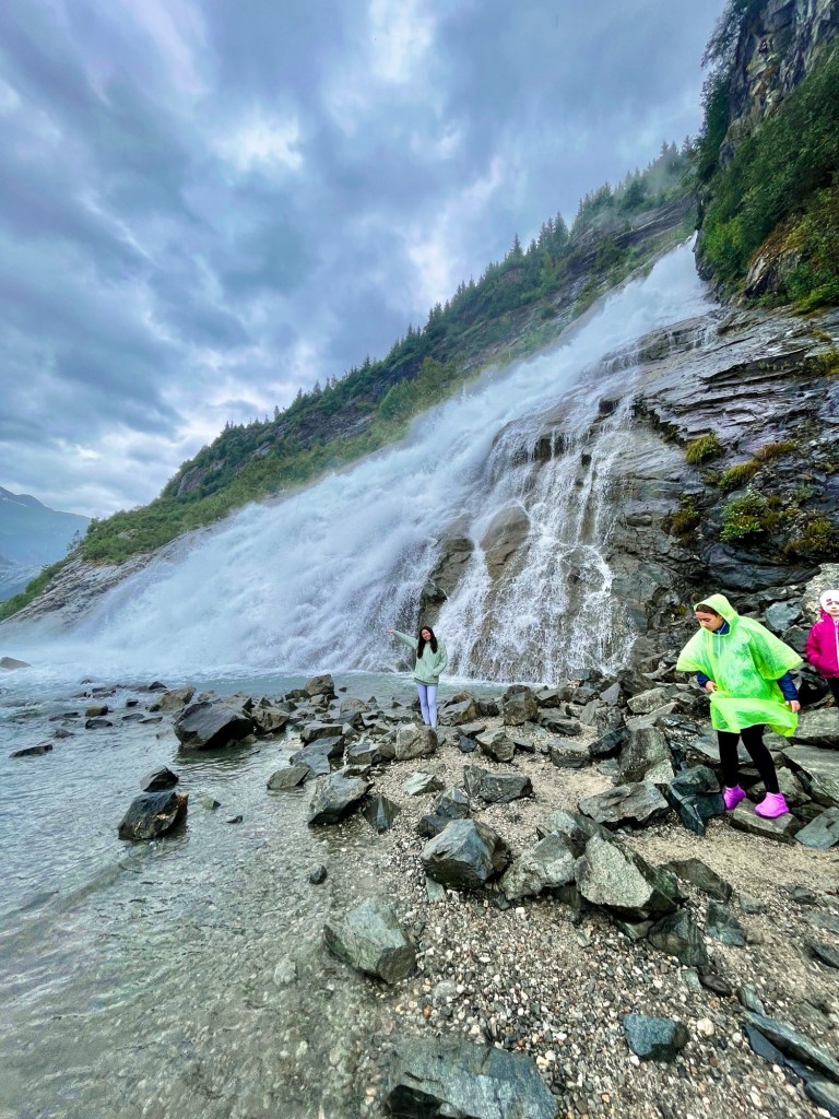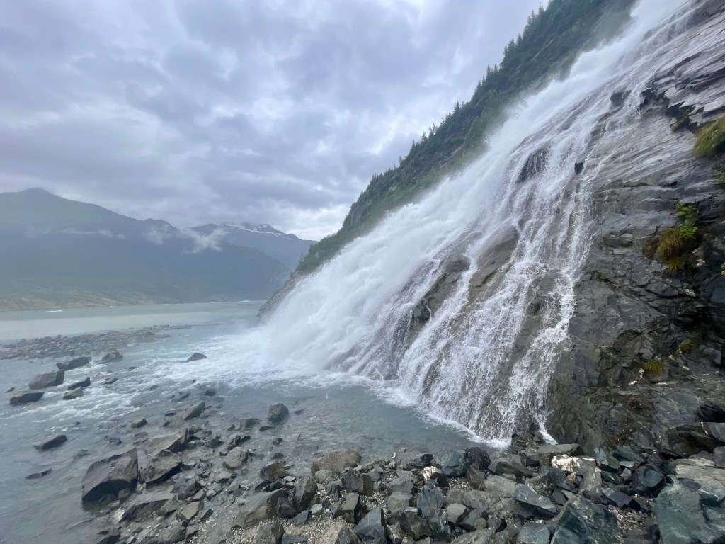 The waterfall flows into Mendenhall Lake, which is perfect for seeing the glacier in the background of your photos during your approach to the falls and at the falls! Definitely prepared for your clothes to get wet!