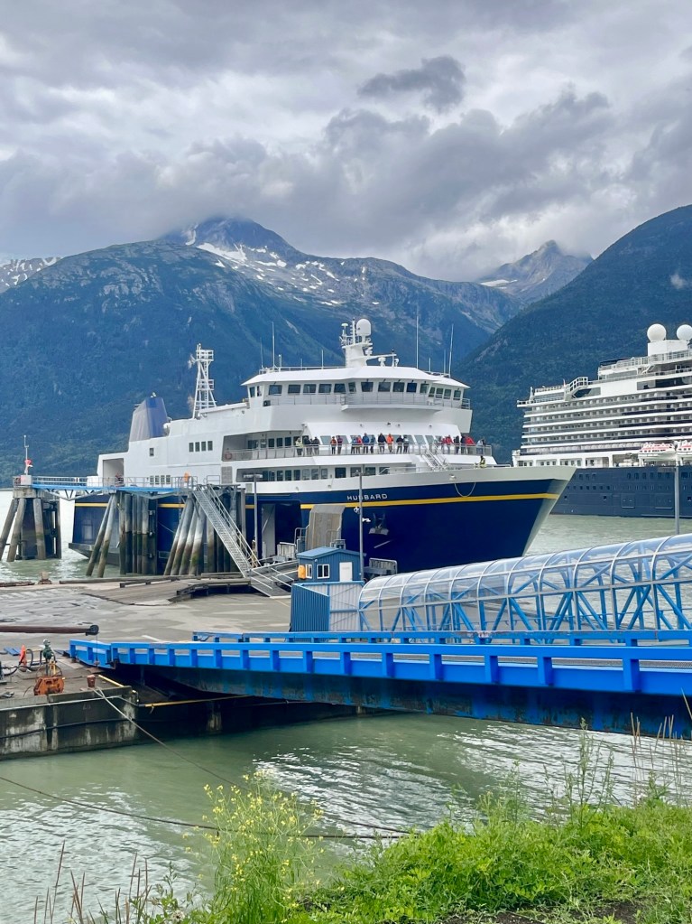 - By ferry: Since we were taking a road trip through Alaska, we took the ferry from Skagway, Alaska and drove our car onto the ferry (first time taking a car on a ferry for me). You can read more about that here.