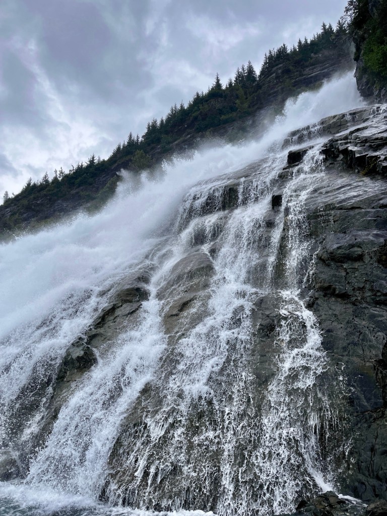 Nugget Falls is a 377-foot waterfall located near the base of Mendenhall Glacier and ended up being one of those unexpectedly beautiful Alaskan landscapes. We just were a bit surprised at how amazing these falls were as the trail to Nugget Falls is relatively short, at 2 miles round trip and around 100 feet elevation gain. Itās possible that we were there on a more āhigh flowā time of day/year for the waterfall, but either way, Iām sure that the hike to the falls will be more than worth it any time of year that it is accessible.