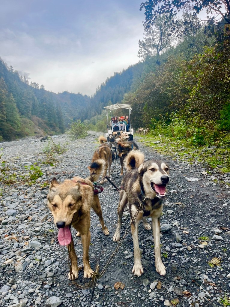 However, it is more than just dog sledding as a lot of the tour involves getting to know the various sled dogs, as well as their mushers! These dogs (and mushers) compete in the famous sled dog races you have likely heard of, such as the Iditarod. Crazy enough (and this still blows our mind), these dogs and their mushers spend a large amount of the summer up on glacier camps near Juneau.