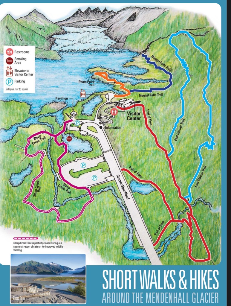The photo below shows a map from the US Forest Service with nearly all of the Mendenhall Glacier area trails, except the West Glacier Trail. This Alltrails link includes the various trails as well and includes the West Glacier Trail!