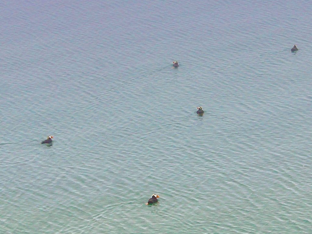 - Puffins: Both horned and tufted puffins live here. They stick out like crazy with the colors of their beaks. Similar to otters, we would typically see these guys in smaller groups floating in the water, as well as flying in the air and diving to the ocean. These were for sure some of the animals we were most hoping to see as we had never seen them before and we saw tons!